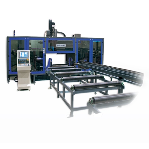 Rotary and axial feed movements are performed by servo-motor. Only the movements of the blocking jaw and the blocking jaw table are hydraulic. Marking can be done on 60 x 150 mm area. Letter height: 12 mm. There is no need to move the profile during marking, since the printhead makes rotational and axial advancement. The printhead pressure force is determined by the hydraulic pressure setting.